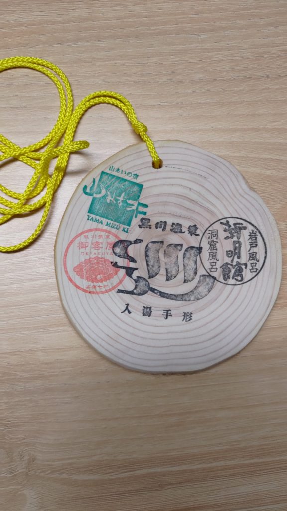裏に3枚シールが貼っておりシール分まで温泉に入れる手形です。最後の一枚は飲食やお土産と交換したりできますので黒川温泉で2か所以上入浴する場合にお得になります。