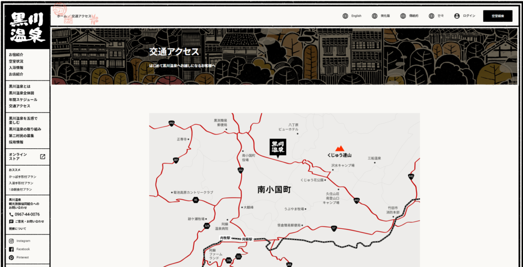 立地上、主要空港や交通機関のアクセスが悪いため一番近い熊本空港からでも車で1時間15分かかります。公式HPで主要交通機関からの所要時間を確認できます。